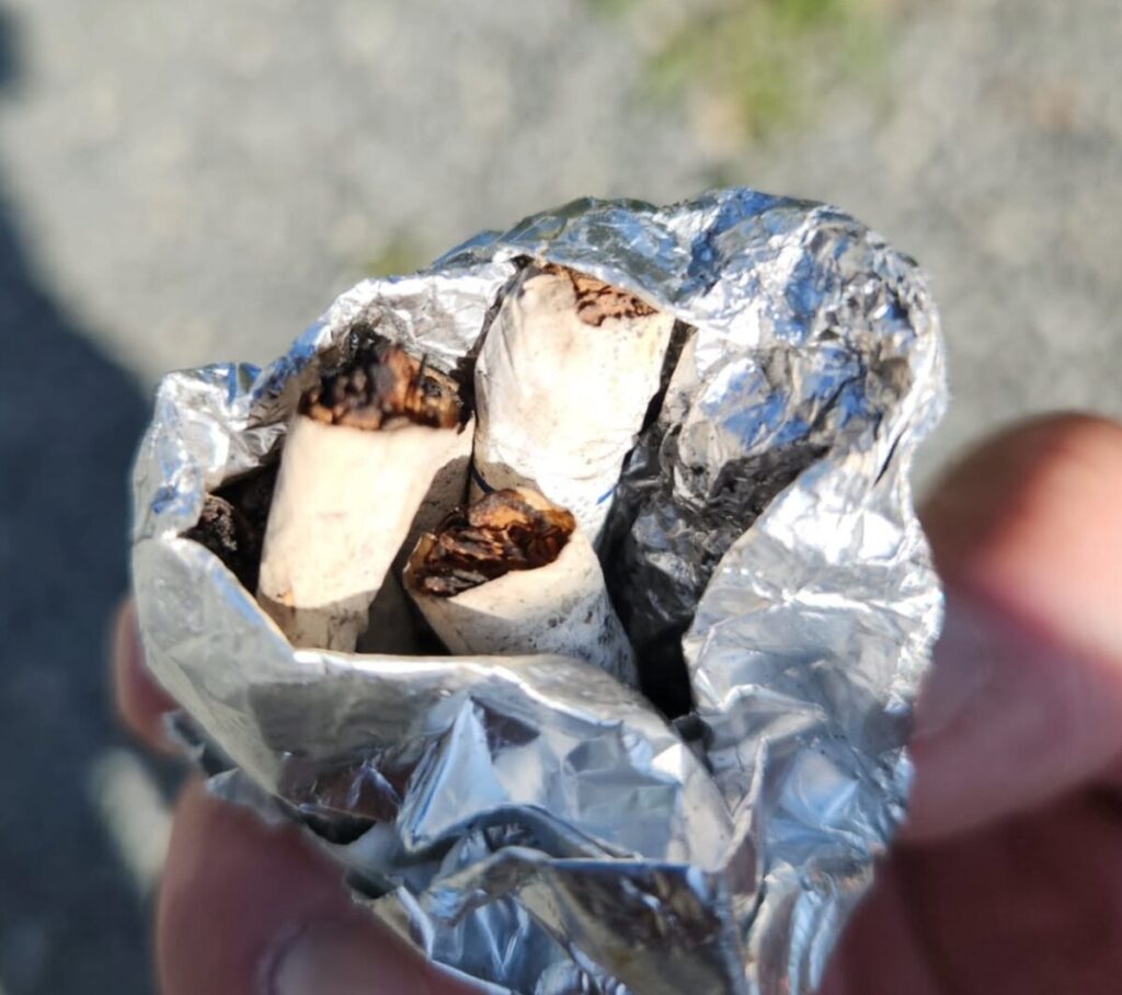 アルミホイルがポイ捨てしてあり、拾ったら、丁寧に中に吸い殻が。こんなに丁寧にホイルに入れたのに、どうして山に捨てる!バカモンです!!